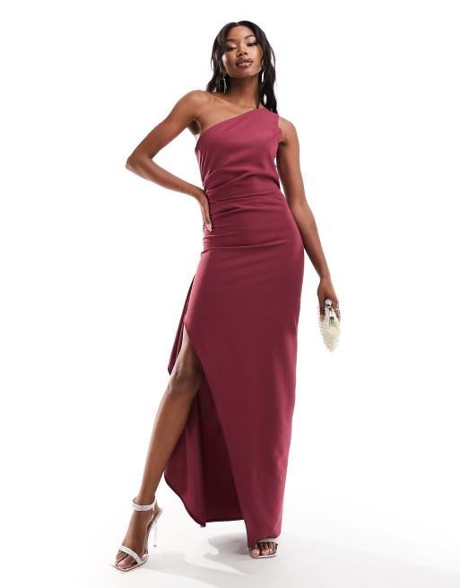 Vesper – Jagodowa sukienka maxi na jedno ramię z rozcięciem i drapowaniem