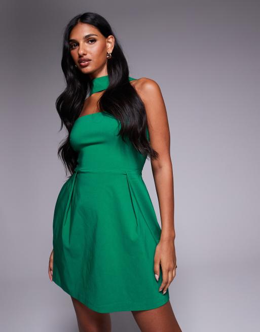Vesper – Szmaragdowa sukienka mini z bengaliny z dekoltem bandeau z chokerem i zakładkami z przodu