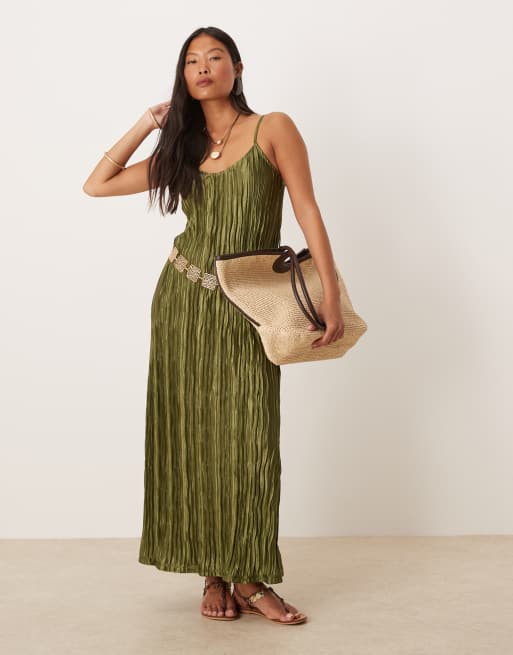 VILA Petite – Oliwkowozielona plisowana sukienka maxi na ramiączkach