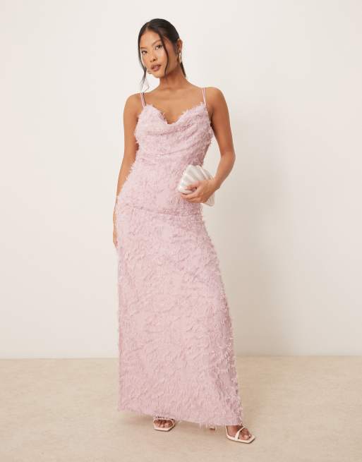 VILA Petite – Różana fakturowana sukienka maxi na ramiączkach z drapowanym dekoltem