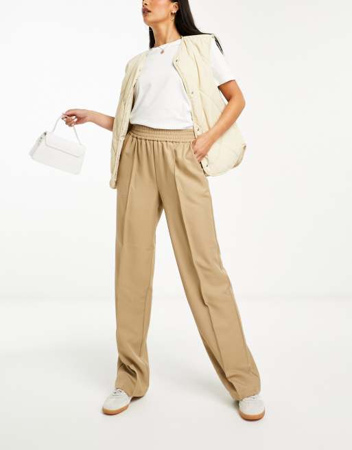 Vila – Beżowe spodnie z szerokimi nogawkami, elastyczną talią i zaszewkami z przodu
