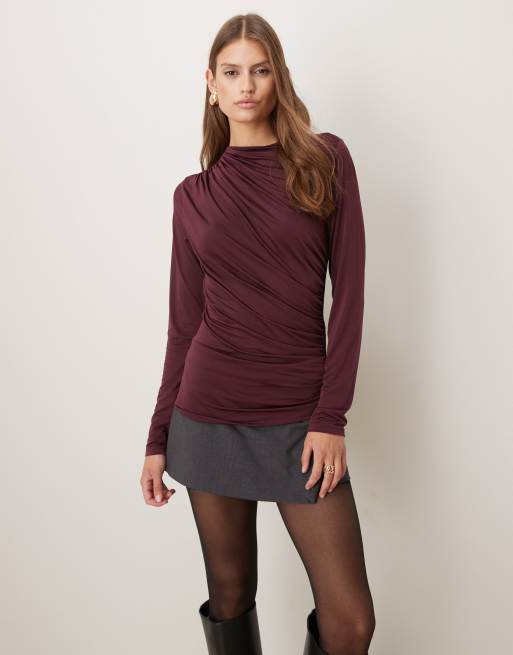 VILA – Bordowy marszczony top z długimi rękawami i zabudowanym dekoltem