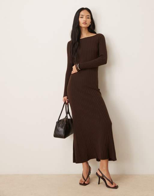 Vila – Brązowa prążkowana sukienka dzianinowa maxi z długimi rękawami