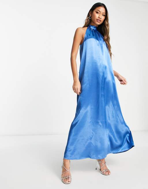 Vila Bridesmaid – Niebieska satynowa sukienka maxi z dekoltem typu halter wiązanym na kokardę z tyłu