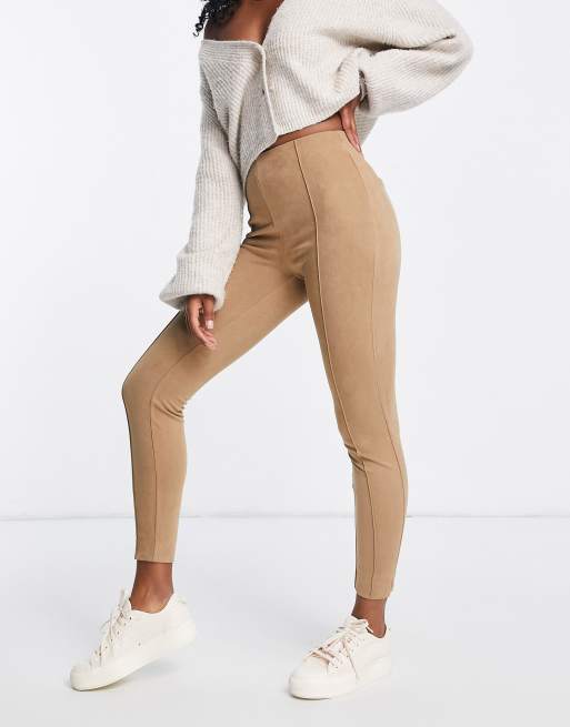 Vila – Camelowe spodnie z imitacji zamszu z przeszyciem w kancie z przodu – TAN