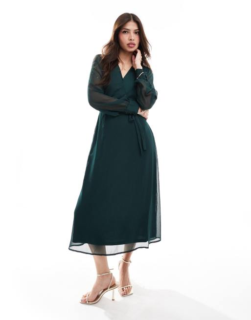 Vila – Ciemnozielona sukienka midi z długim rękawem i dekoltem w kształcie litery V