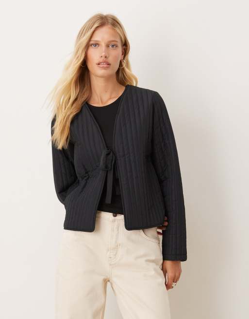 Vila – Czarna pikowana kurtka z wiązaniem z przodu