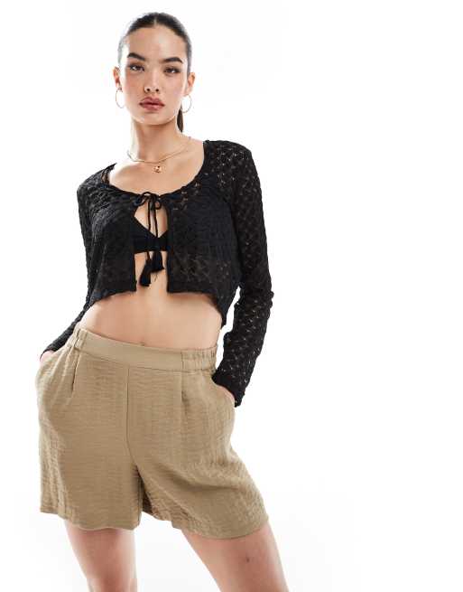 Vila – Czarny elastyczny kardigan szydełkowany z wiązaniem z przodu