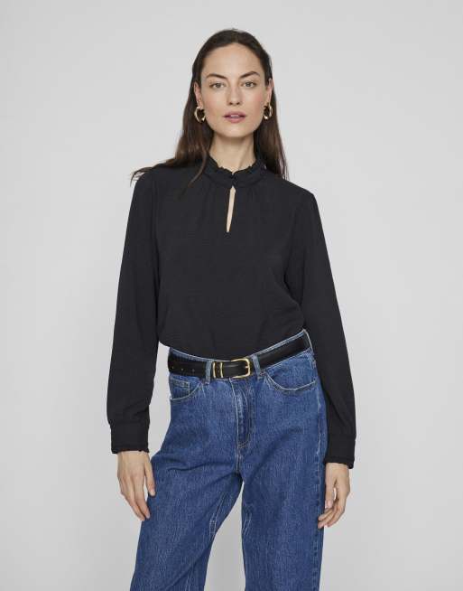 Vila – Czarny koronkowy top z długim rękawem