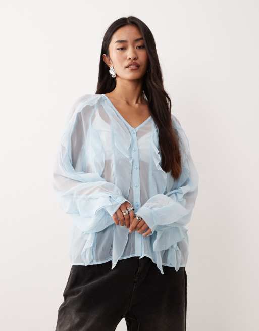 Vila – Jasnoniebieska bluzka z długimi rękawami i falbankami