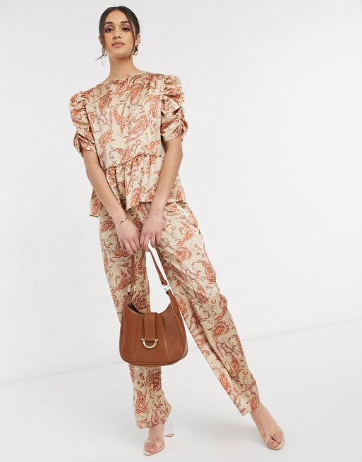 Vila – Jedwabisty zestaw ze wzorem paisley: kopertowy top i spodnie z szerokimi nogawkami