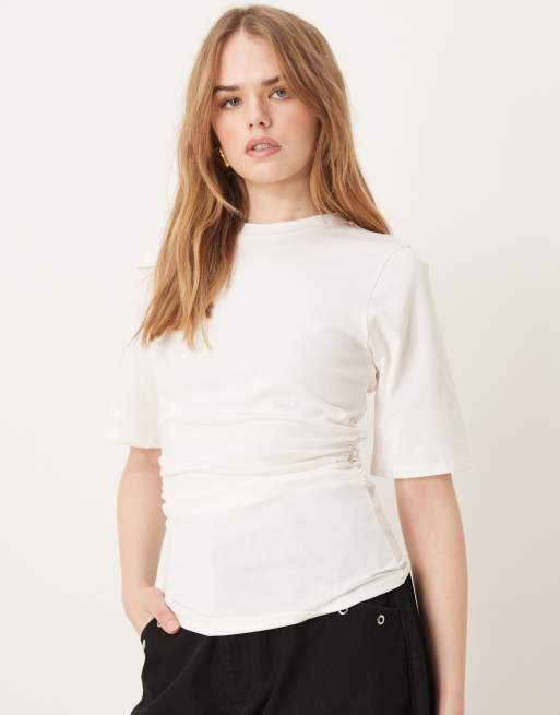 VILA – Kremowy T-shirt z krótkimi rękawami i marszczeniem na bokach