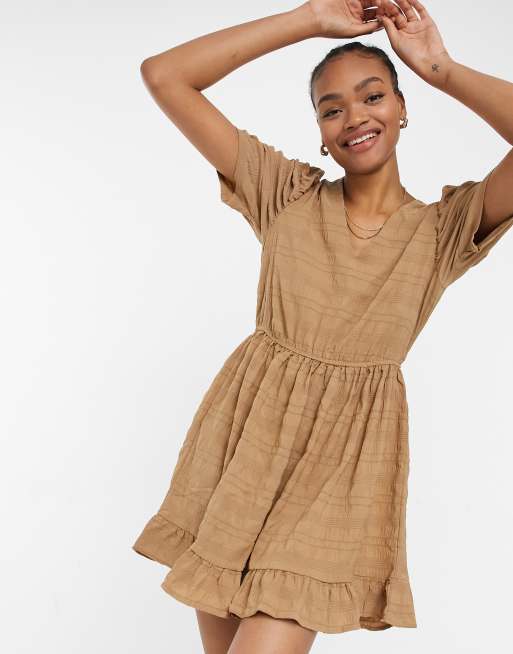 Vila – Luźna sukienka z bufiastymi rękawami z teksturowanego materiału w kolorze camelowym