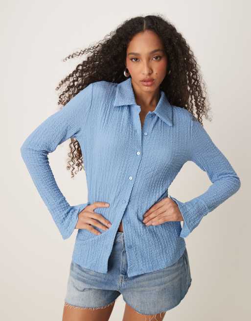 VILA – Niebieska zapinana na guziki koszula z długimi rękawami i bąbelkową teksturą