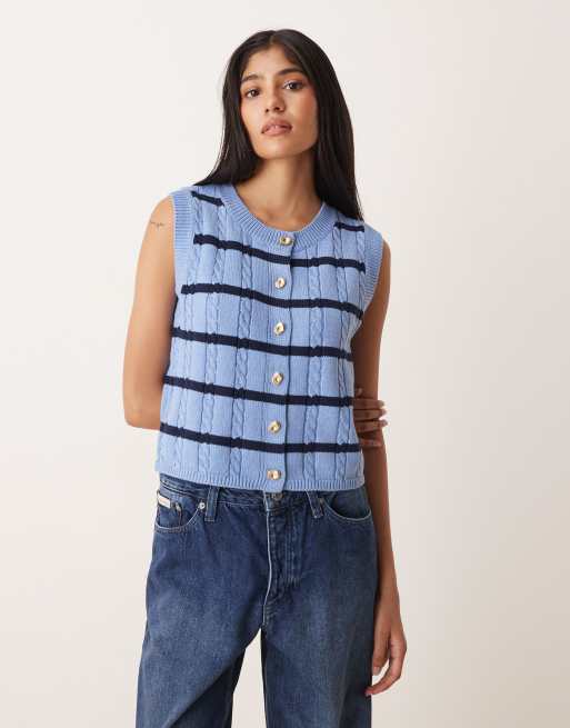 VILA – Niebieski zapinany na guziki bezrękawnik w paski z dzianiny o warkoczowym splocie
