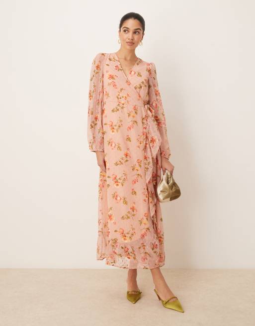 VILA – Różana kopertowa sukienka maxi z materiału dobby w kwiaty z falbanką
