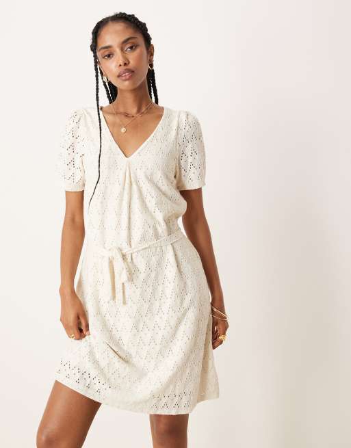 VILA – Wiązana z przodu kremowa sukienka z bufkami i dżersejowym haftem angielskim