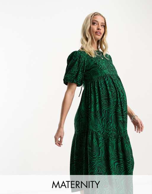 Violet Romance Maternity – Zielona sukienka midi z bufkami w zwierzęcy wzór