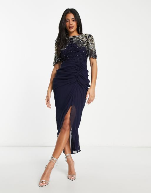Virgos Lounge – Granatowa zdobiona sukienka maxi z krótkimi rękawami