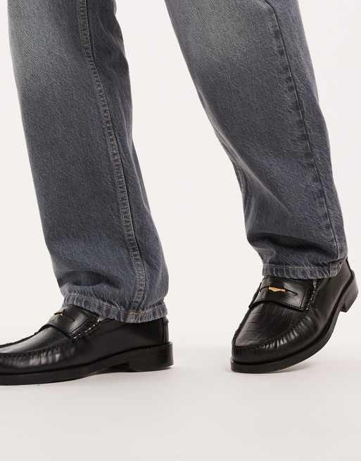 Walk London – Dalston – Czarne skórzane loafersy penny w tłoczony wzór