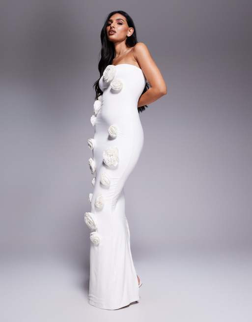 Wanderdoll – Palma – Dopasowana kremowa sukienka maxi typu rybka z dekoltem bandeau i bukiecikami