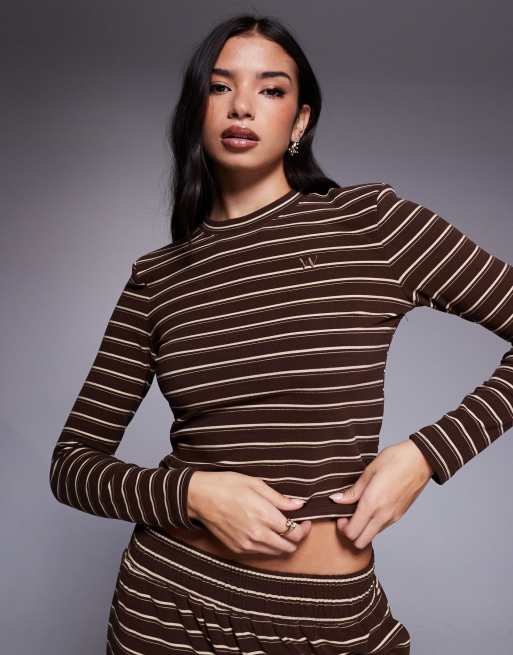 Wanderdoll Premium – Frankie – Gruby dżersejowy brązowy top w paski z długimi rękawami i okrągłym dekoltem, część zestawu