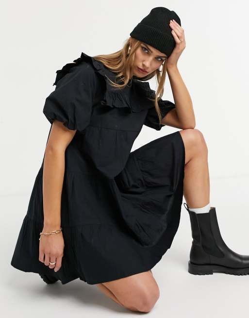 Warehouse – Czarna sukienka mini z karczkiem wykończonym falbanką