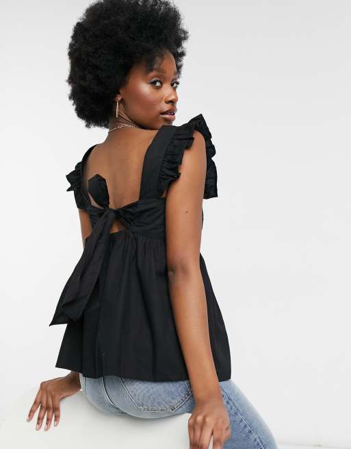 Warehouse – Czarny top z falbanką i wiązaniem na plecach