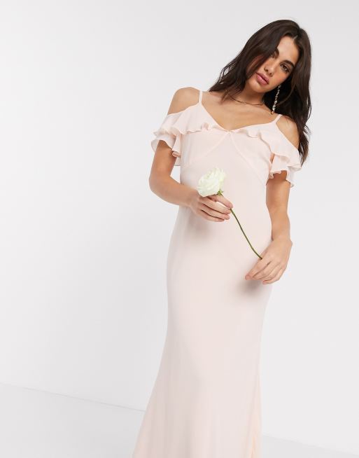 Warehouse – Sukienka maxi z odkrytymi ramionami, falbanką i guzikami z tyłu, pudrowy róż