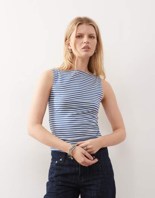 Weekday – Annie – Miękki top bez rękawów z dekoltem w łódkę w niebieskie i kremowożółte paski – tylko w ASOS