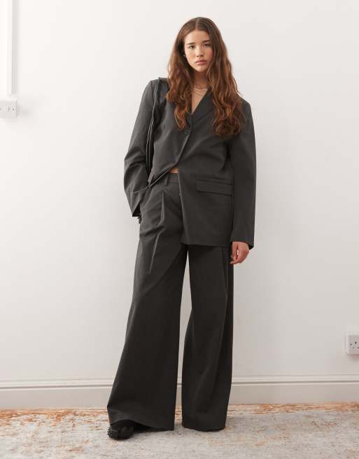Weekday – Ciemnoszare melanżowe spodnie oversize z szerokimi nogawkami i zakładkami, część zestawu