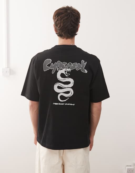 Weekday – Czarny T-shirt o luźnym kroju, z nadrukiem i napisem „Cyber snake”