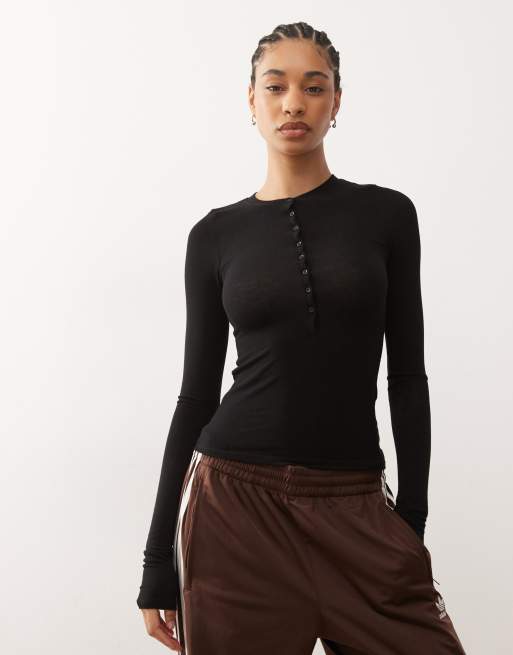 Weekday – Czarny T-shirt z dekoltem henley i długimi rękawami