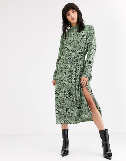 Weekday – Davida – Brązowo-miętowa sukienka midi z abstrakcyjnym wzorem