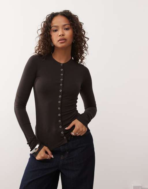 Weekday – Dopasowany ciemnobrązowy top z długimi rękawami i zapięciem na guziki