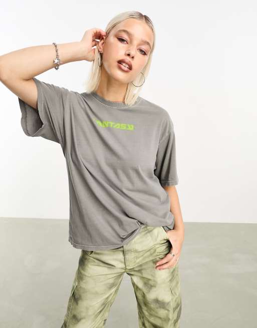 Weekday – Gen – Szary T-shirt oversize z nadrukiem „Fantasy“ i efektem znoszenia