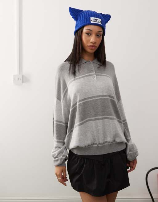 Weekday – Joline – Szary melanżowy sweter oversize w kołnierzykiem polo w paski