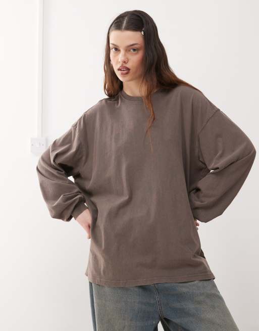 Weekday – Lindy – Szarobrązowy T-shirt super oversize z długimi rękawami
