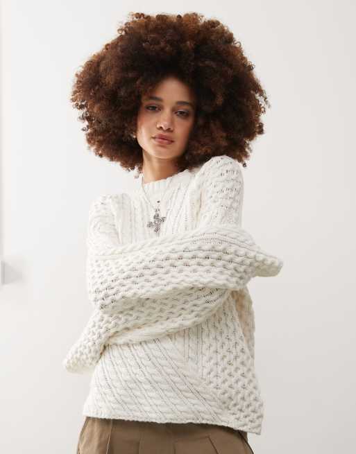 Weekday – May – Sweter z dzianiny o asymetrycznym warkoczowym splocie w kolorze złamanej bieli