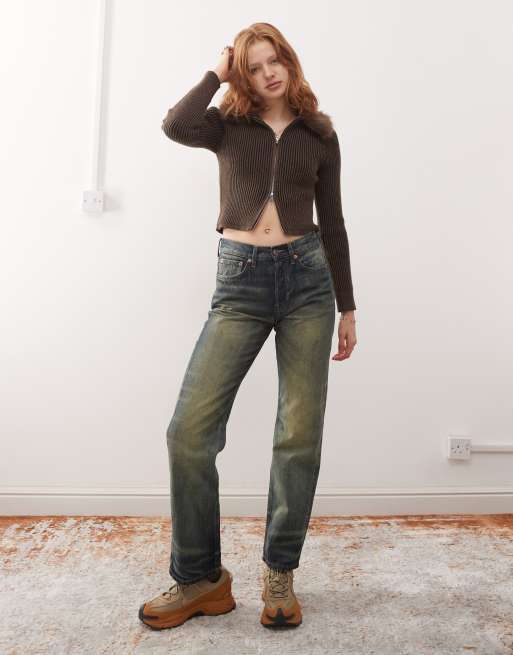 Weekday – Orbit – Ciemnoniebieskie jeansy z prostymi nogawkami, średnim stanem i efektem znoszenia