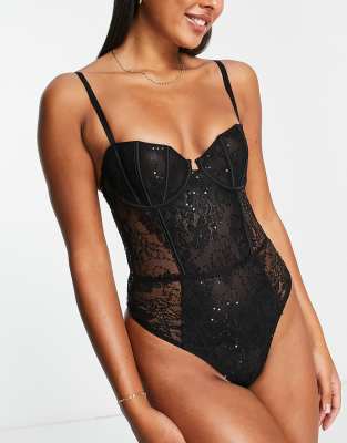 Wild Lovers – Samantha – Czarne koronkowe body zdobione cekinami z fiszbinami