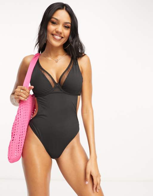 Wolf & Whistle Fuller Bust – Czarny siateczkowy strój kąpielowy z wycięciem – tylko w ASOS