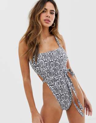 Wolf & Whistle – Fuller Bust – Exclusive – Strój kąpielowy z nadrukiem skóry węża z wysokim wycięciem i paskiem – MULTI