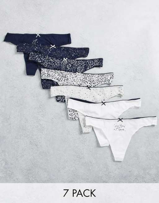 Women'secret – Zestaw 7 par stringów we wzór z gwiazdami i księżycem w odcieniach granatu
