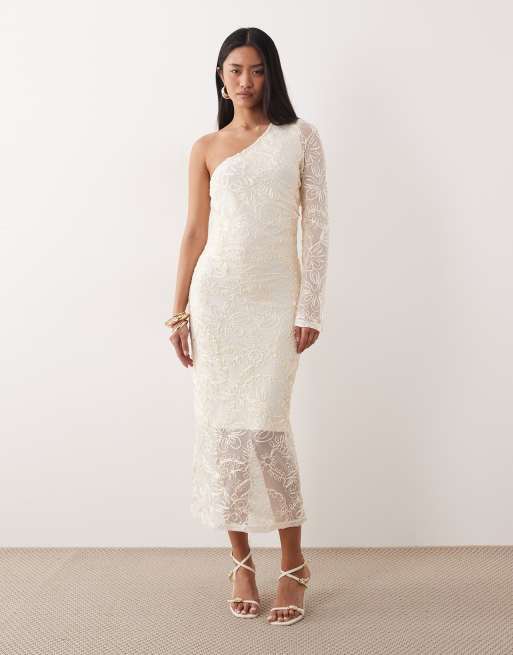 YAS – Biała sukienka maxi na jedno ramię z satynowym haftem