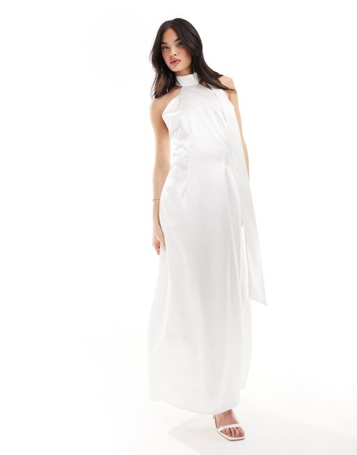 YAS Bridal – Biała ślubna satynowa sukienka maxi z dekoltem halter i drapowanym szalem