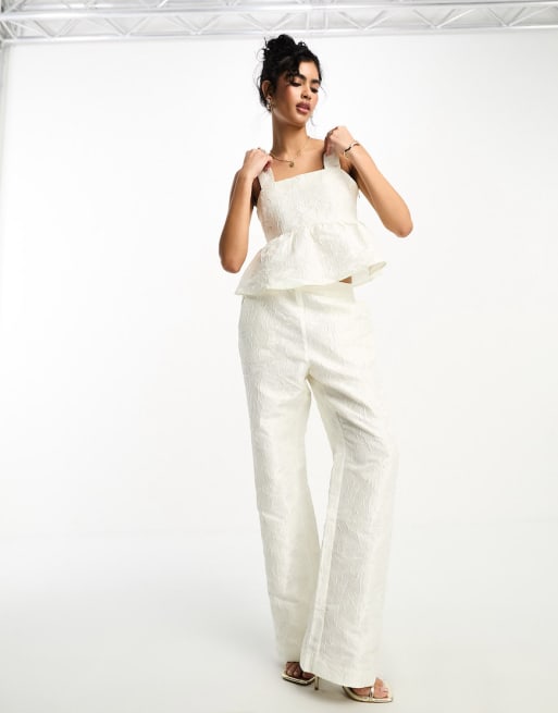 Y.A.S Bridal – Biały ślubny żakardowy zestaw: top z baskinką i spodnie