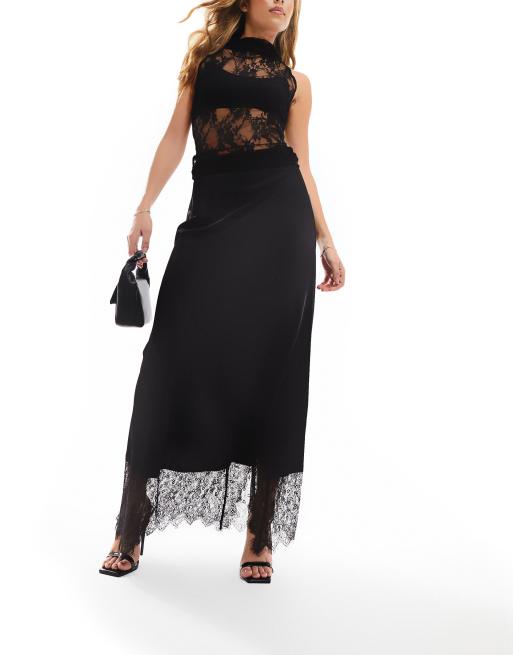 Y.A.S – Czarna satynowa spódnica maxi z rozcięciem z boku i koronką