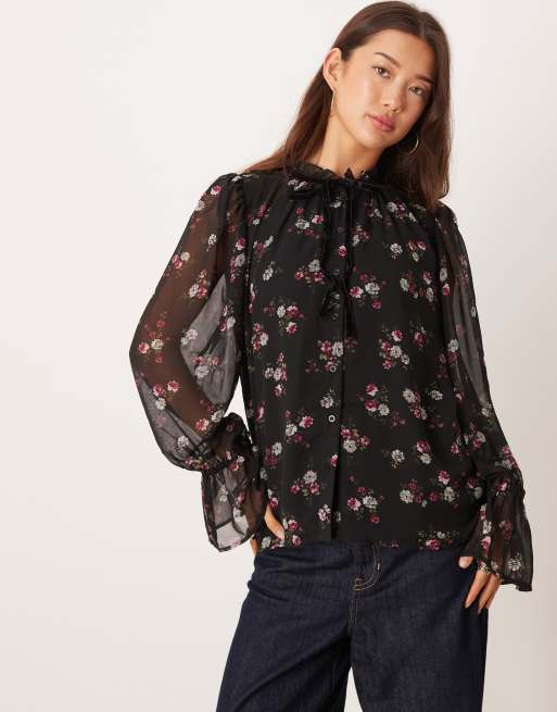 YAS – Czarna szyfonowa bluzka z falbankami w kwiatowy wzór w stylu boho