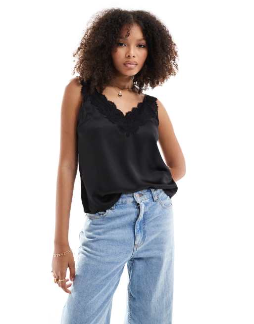 Y.A.S – Czarny satynowy top na ramiączkach z koronkową wstawką